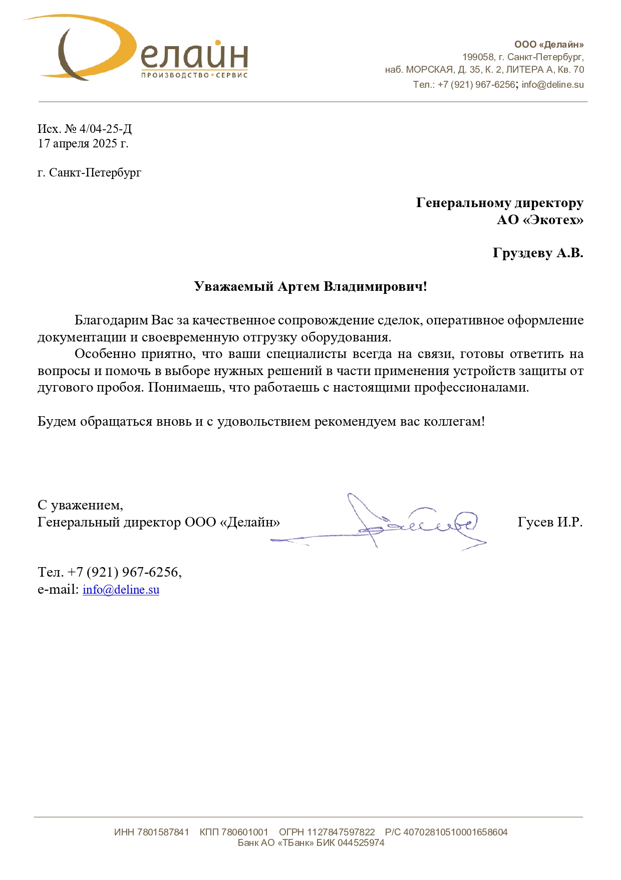 Выражаем благодарность вашей команде за оперативную обработку нашего запроса и быструю отгрузку устройств защиты от дугового пробоя. Очень приятно работать с компанией, где всегда держат слово и действительно заботятся о клиентах